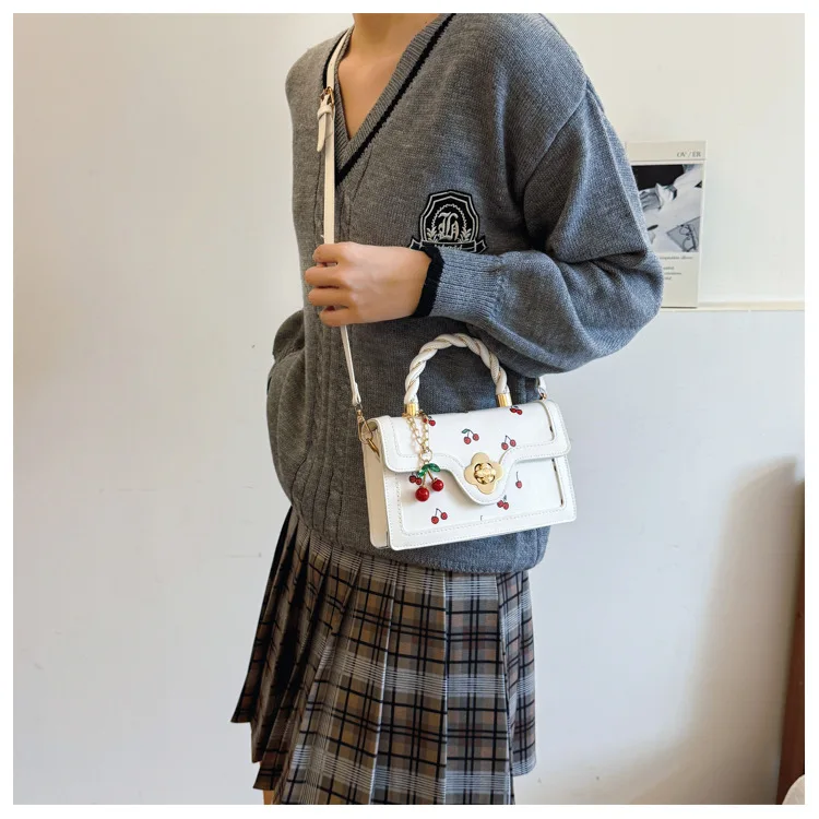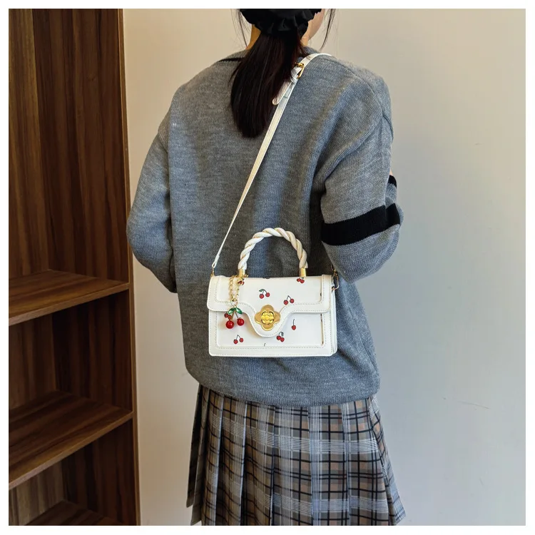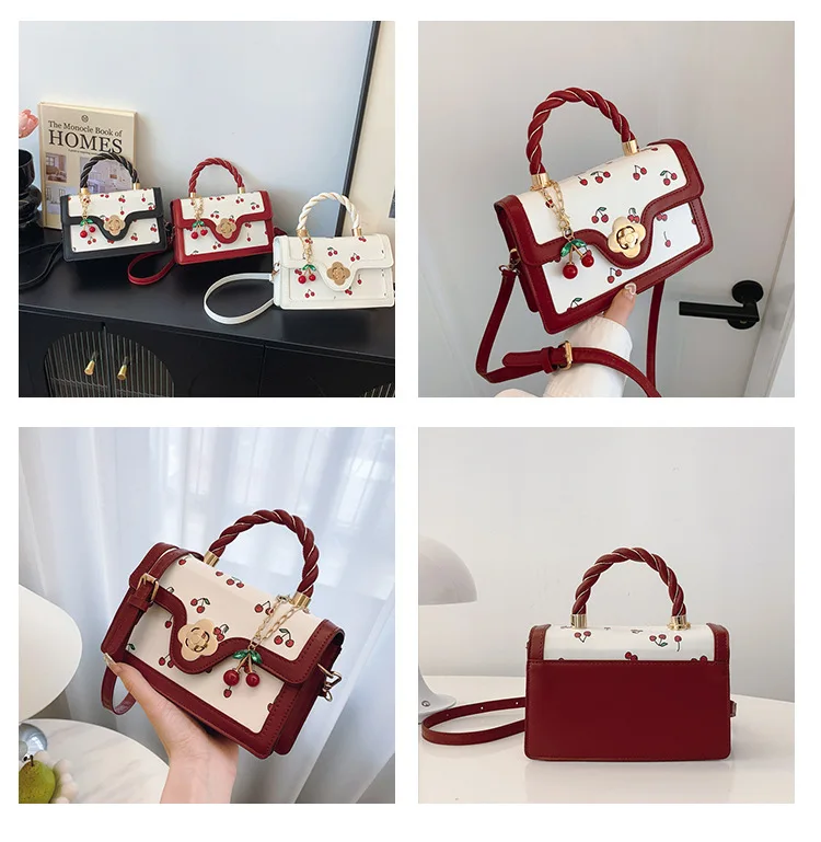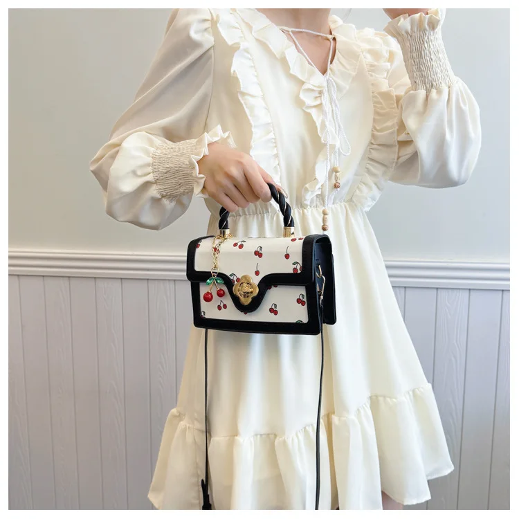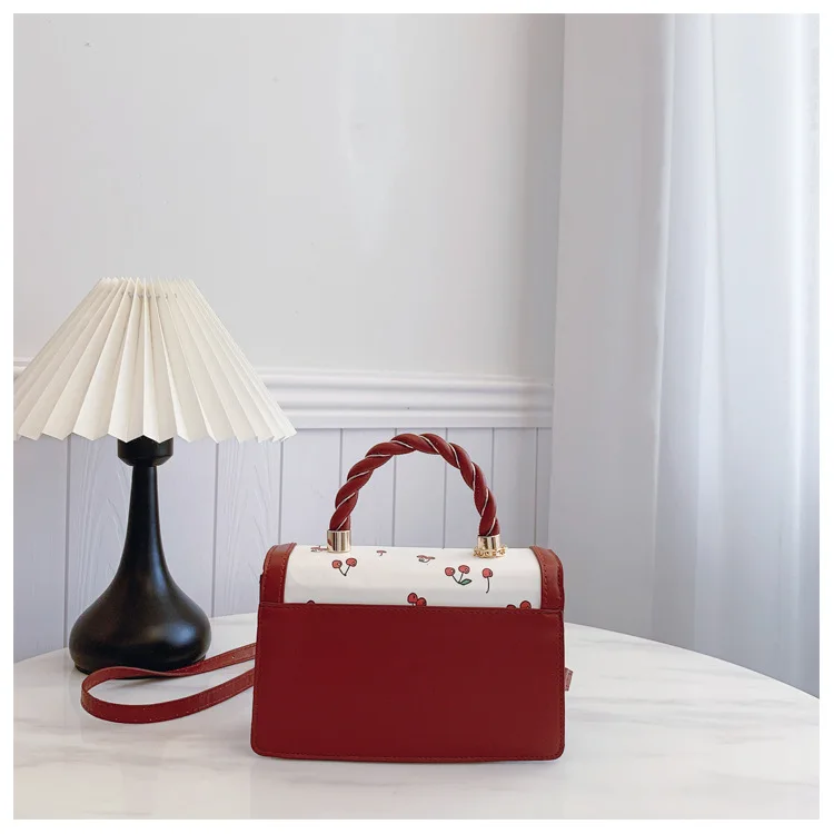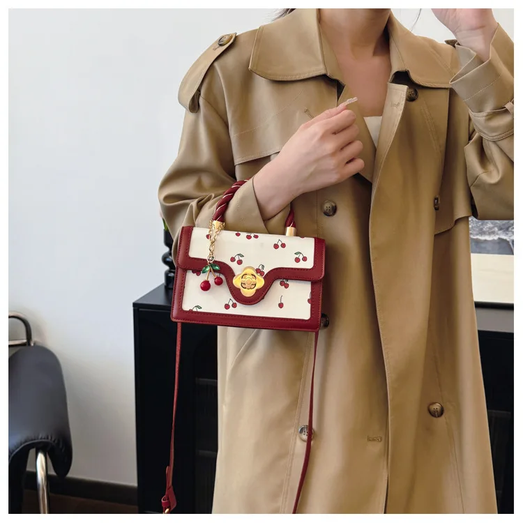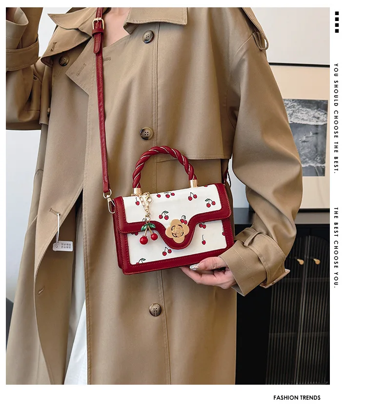 2025 Cute Cherry Print Crossbody Bag Fried Dough Twists Handheld Small Square Bag Fresh Color Contrast Design Girl Bag